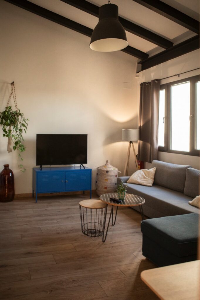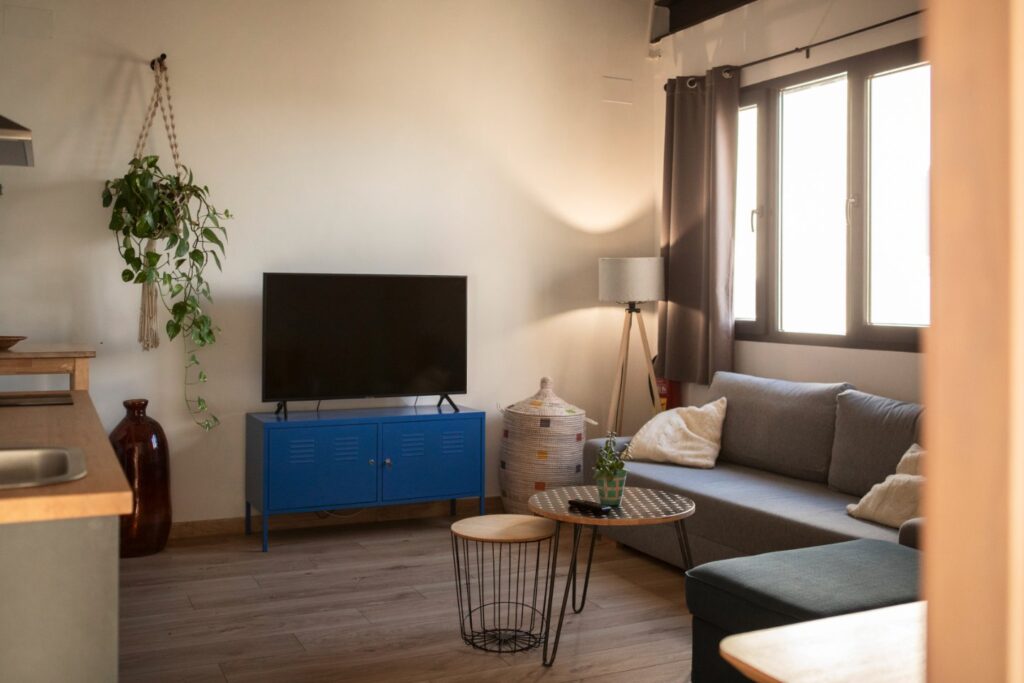 Cocina equipada, salón con zona de comedor y zona de estar con sofá, mesas de centro y gran pantalla con Smart tv.
