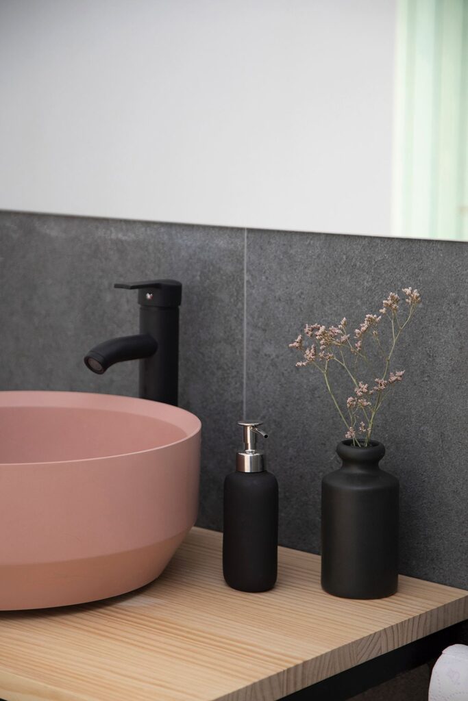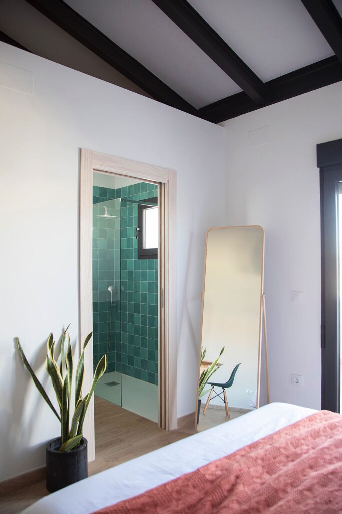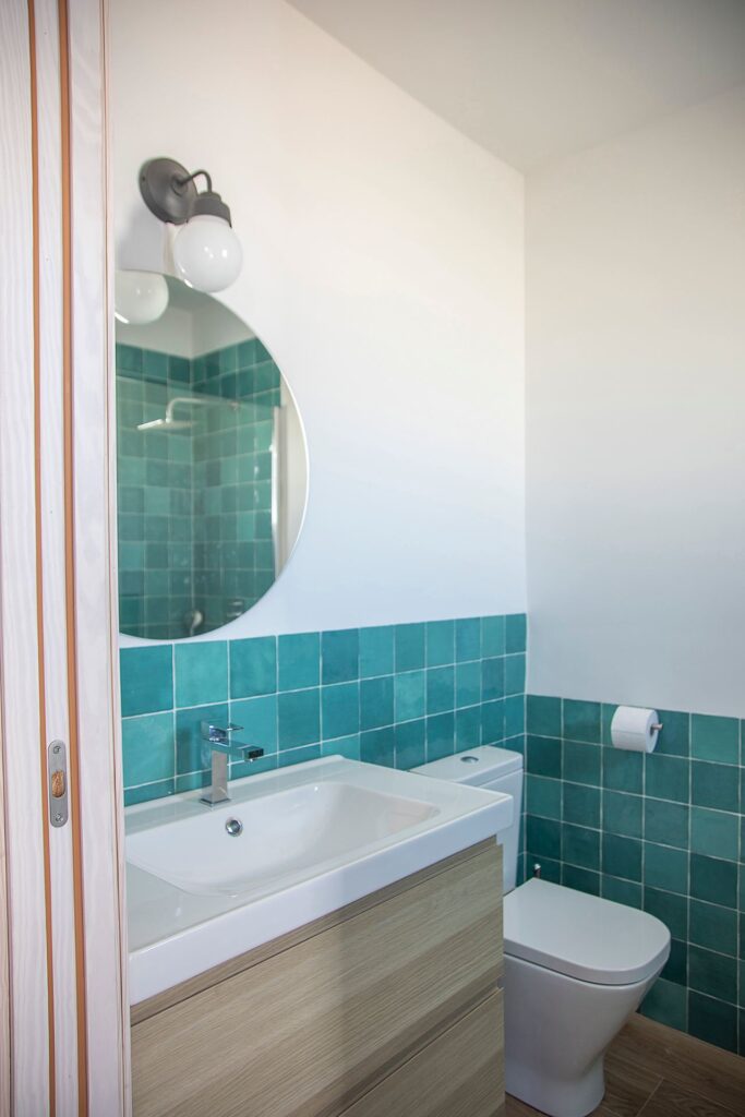 El dormitorio Tomillo dispone de baño privado en suite, completamente renovado y decorado con azulejos en tonos verdes que transmiten calma y frescura. El aseo es moderno y está equipado con ducha amplia, mueble de lavabo de madera y un espejo redondo que completa el ambiente.