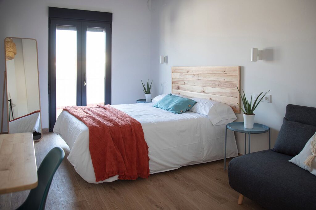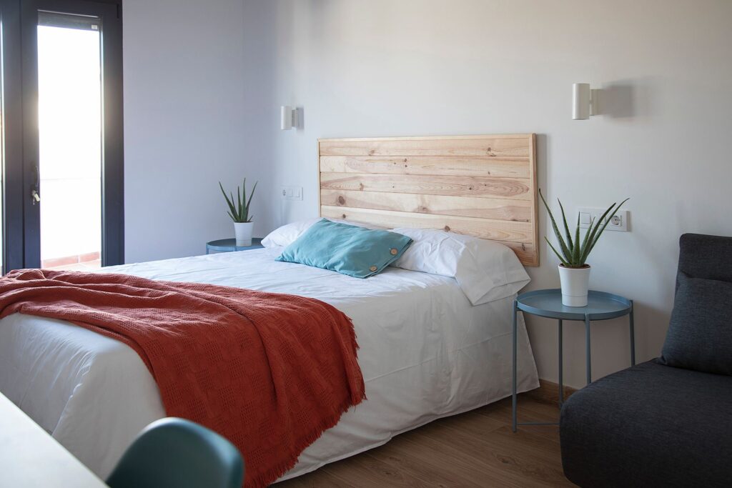 La estancia cuenta con una cómoda cama doble vestida en textiles suaves y acompañada de un cabecero de madera natural que aporta personalidad y un toque acogedor. Los cojines y la manta en tonos tierra y azules añaden armonía y frescura, creando una atmósfera perfecta para desconectar.