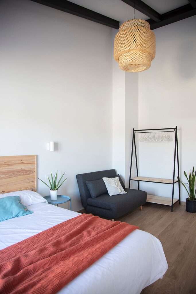Un práctico sofá individual convierte este dormitorio en un espacio versátil, ideal para relajarse con un libro o como cama adicional si se necesita. El mobiliario, minimalista y funcional, incluye mesitas metálicas, plantas naturales y un perchero de diseño moderno que aportan estilo sin restar sensación de amplitud.