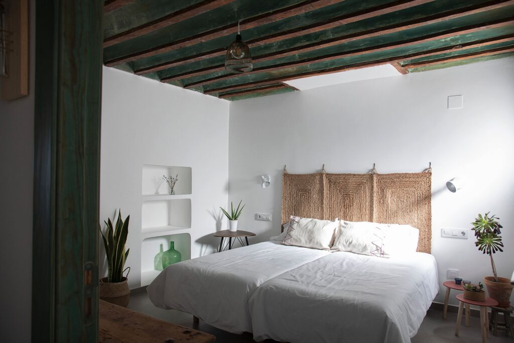 El dormitorio Encina es un refugio con esencia rústica y alma contemporánea. Su carácter único se percibe desde el primer momento gracias a su techo original de vigas de madera verde envejecida, un elemento histórico que aporta calidez, autenticidad y un aire acogedor que conecta directamente con la esencia de la casa rural.