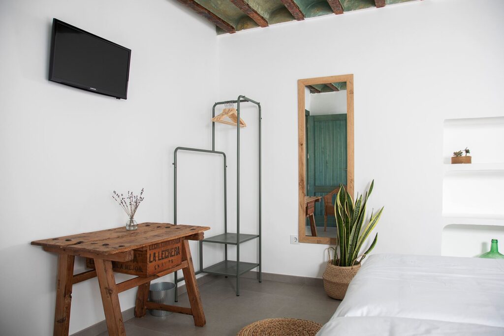 El dormitorio Encina dispone además de zona de escritorio, televisión, un práctico perchero abierto, así como elementos decorativos vegetales que aportan frescor y armonía. Todo ello dispuesto sobre una paleta natural que combina blancos puros, verdes suaves y tonos tierra.